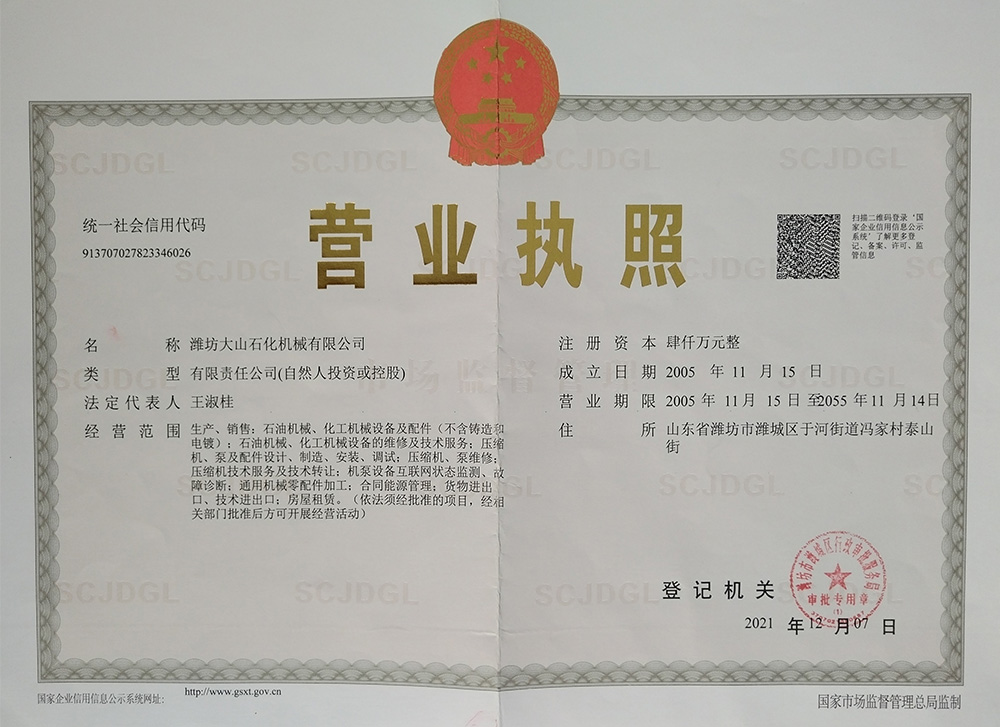 潍坊大山石化机械有限公司是一家集设计、生产、销售、服务于一体的科技型企业,主要从事往复压缩机整机制造、配件加工、维修服务等相关业务,公司现有职工60余人,其中高级技术人员16人,公司下设技术、销售、维修服务、生产供应部、综合部等部门。